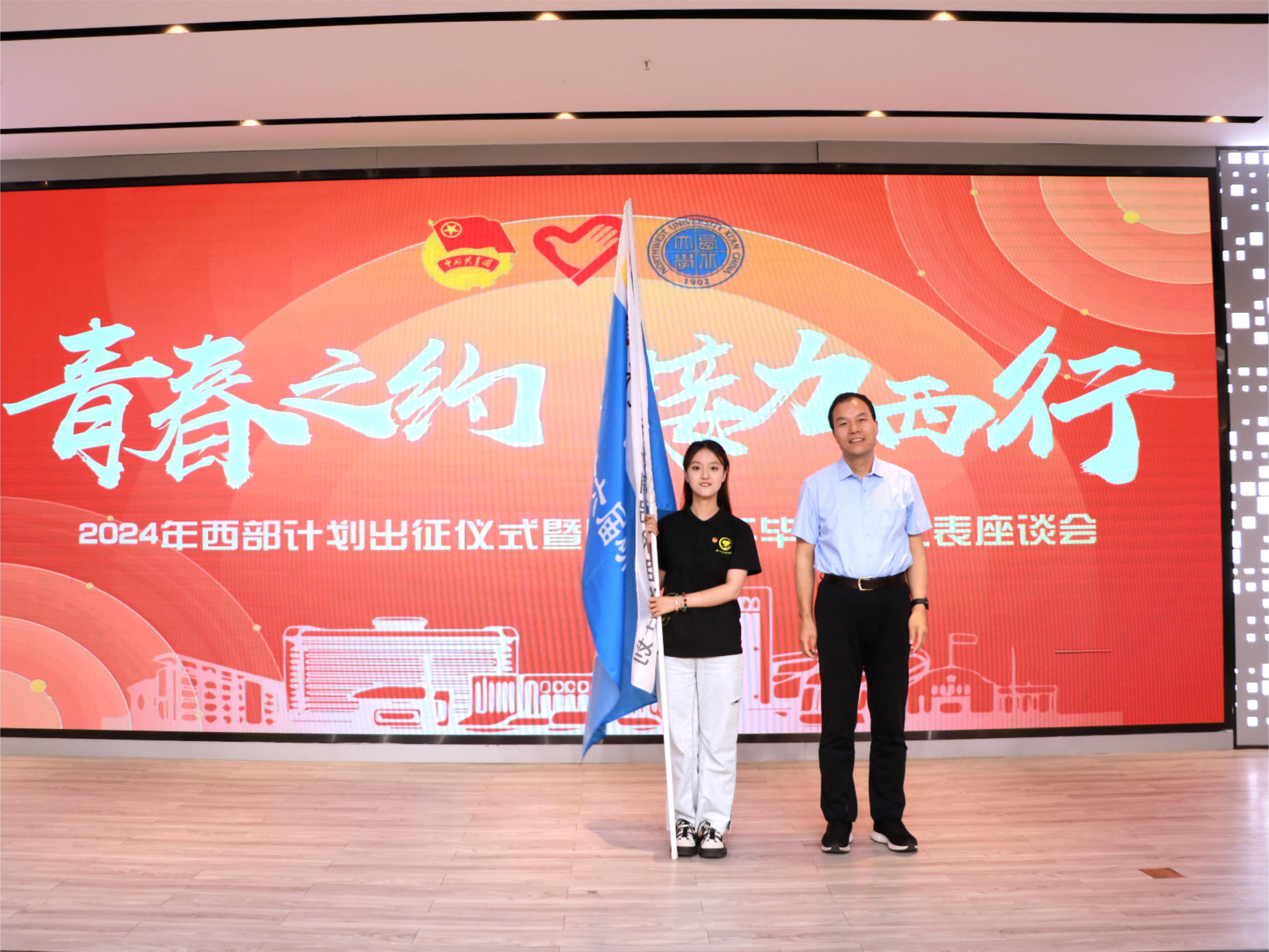 吕建荣分别向西部计划志愿者和第26届研究生支教团授旗。