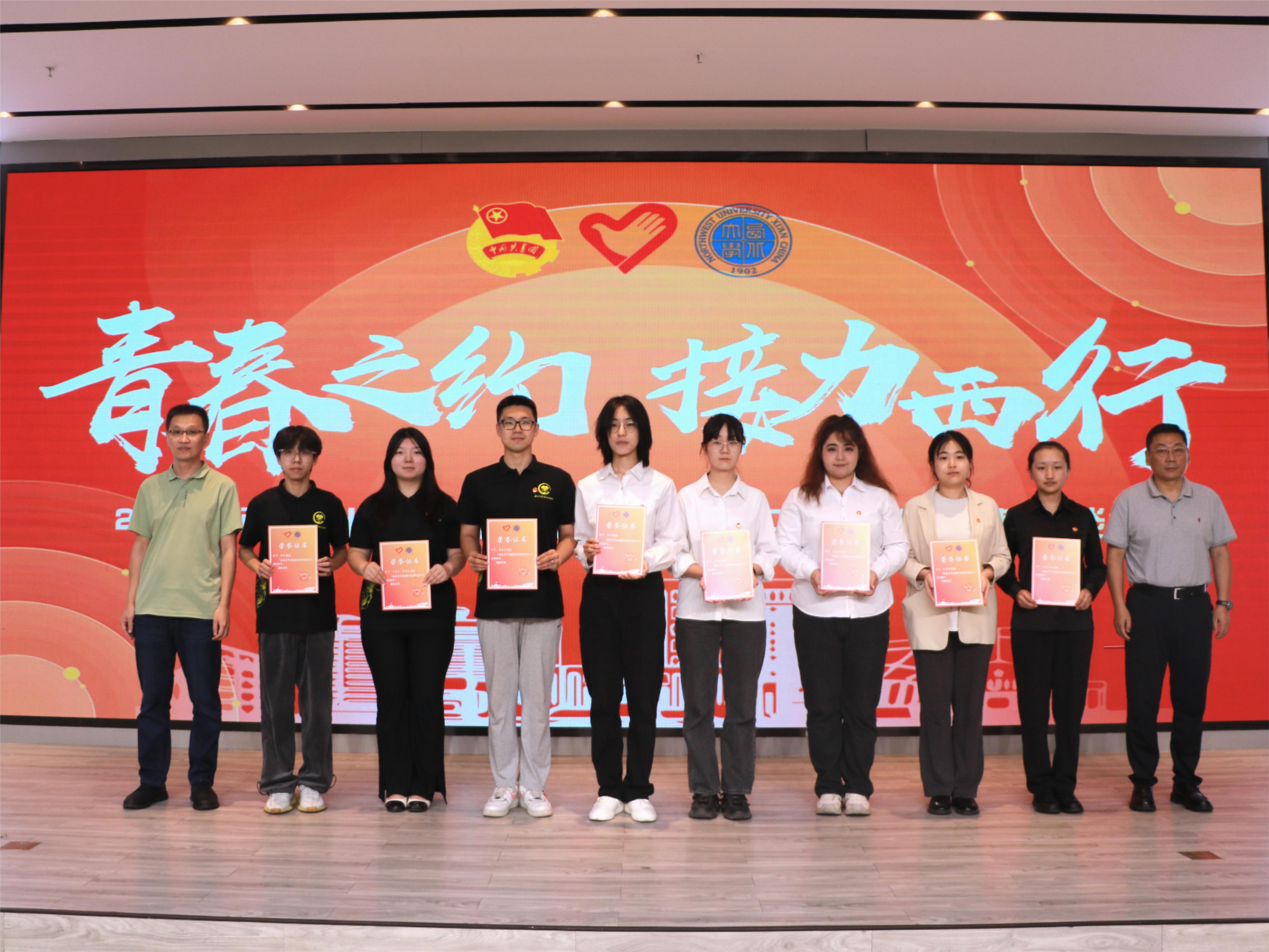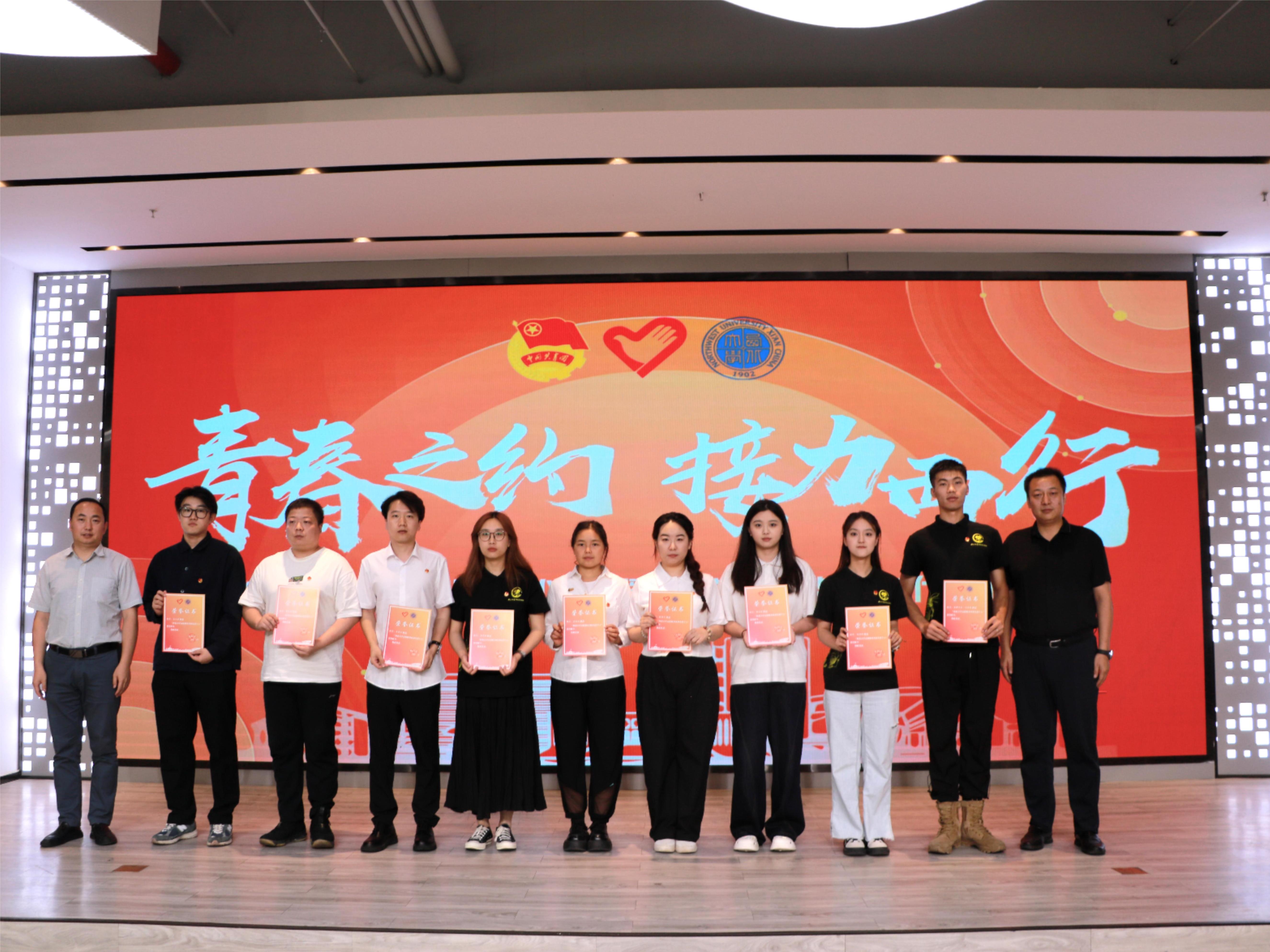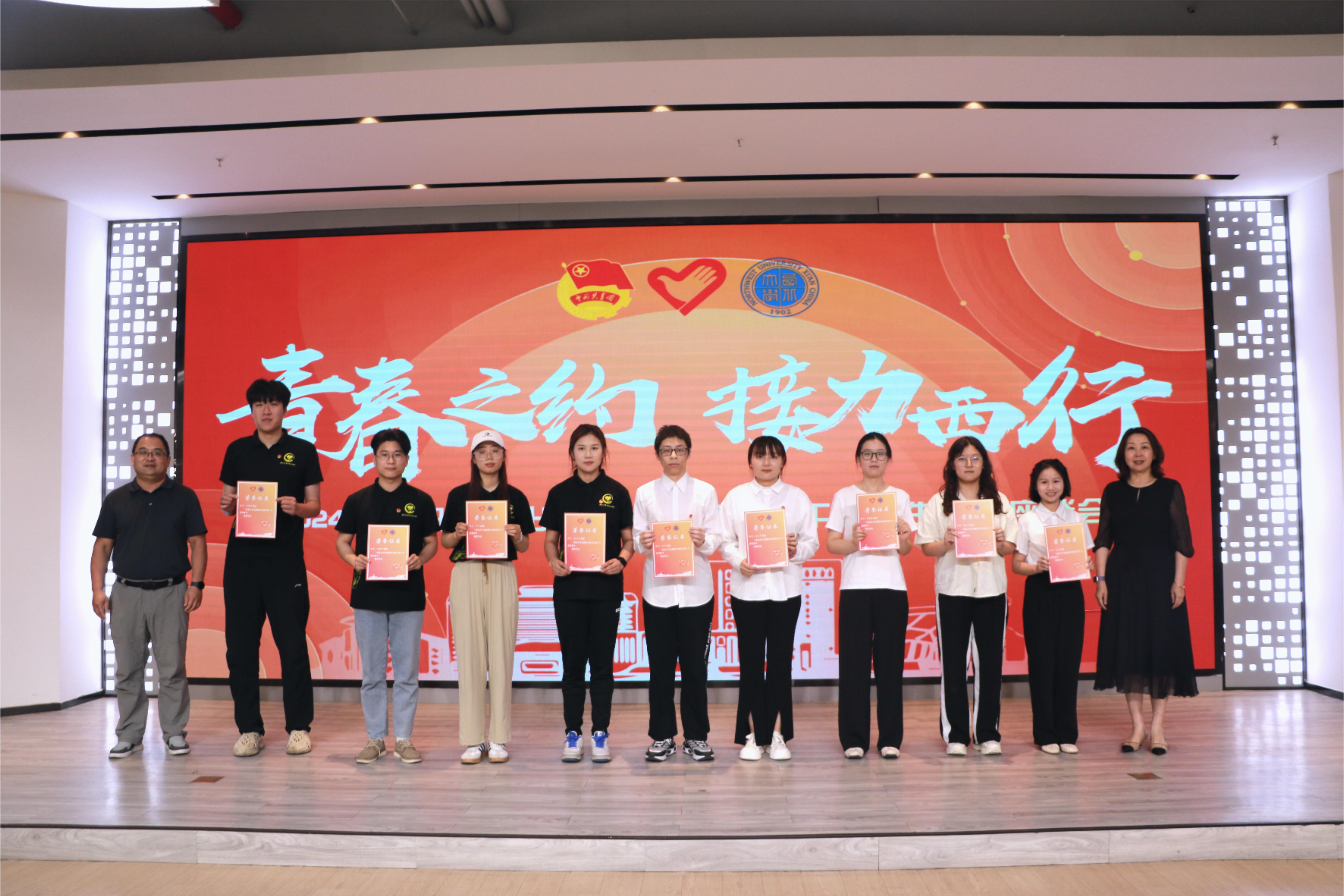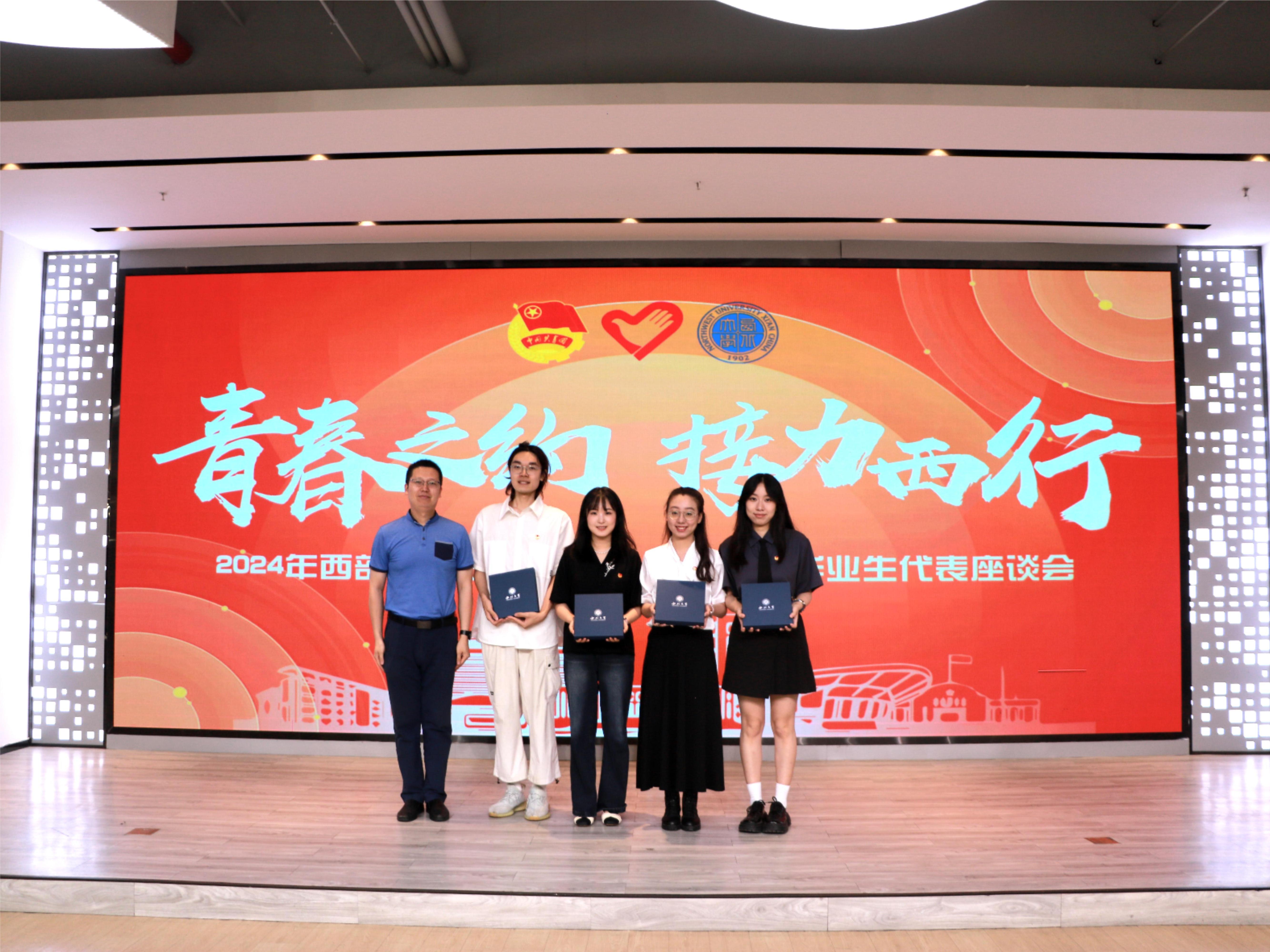 团学骨干毕业生代表邬新萌、史若毓、高紫晗、孟雷围绕团学组织工作分享了自己青春成长的故事。与会相关单位负责人分别为西部计划志愿者颁发荣誉证书。校团委负责人向团学骨干毕业生代表赠送纪念品。