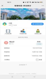 1.进入全讯600cc大白菜移动校园应用,点击“Y.移动访客”,进入“智慧校园 移动接访”,通过分享申请码或代客申请提交访客申请信息。
