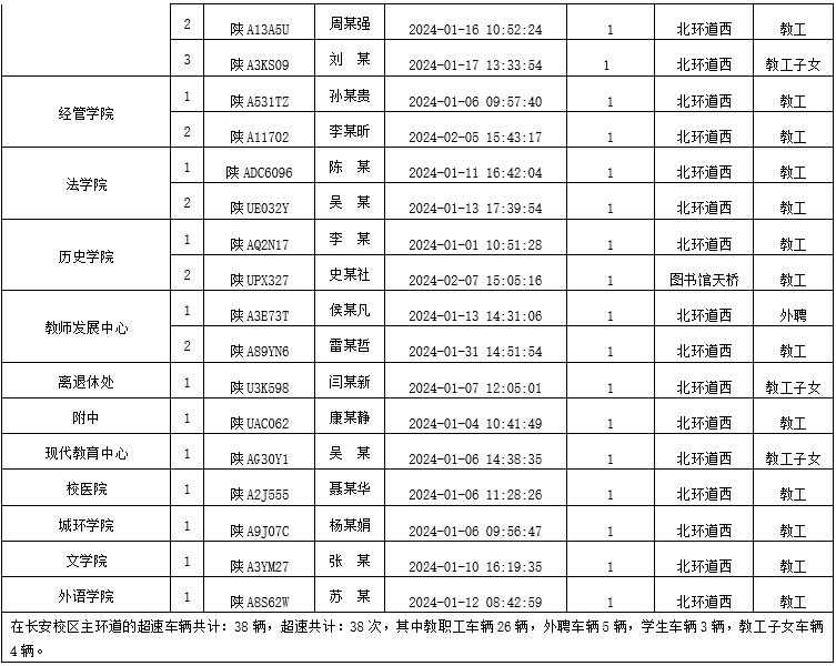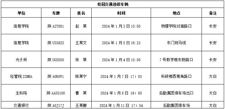 为加强校内道路交通安全管理,规范校内交通秩序,根据《全讯600cc大白菜校园道路交通管理办法》有关要求,现将2024年1月校园交通违章车辆予以曝光,所在单位负责对本单位违章师生员工进行交通安全教育和日常管理。