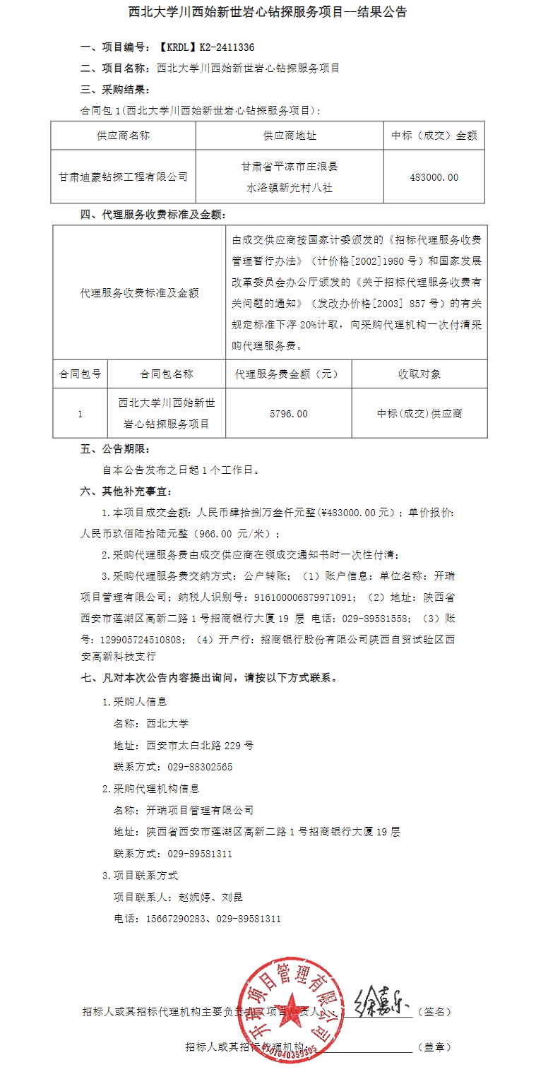 全讯600cc大白菜西安市古生物信息学重点实验室岩芯钻取服务项目结果公告