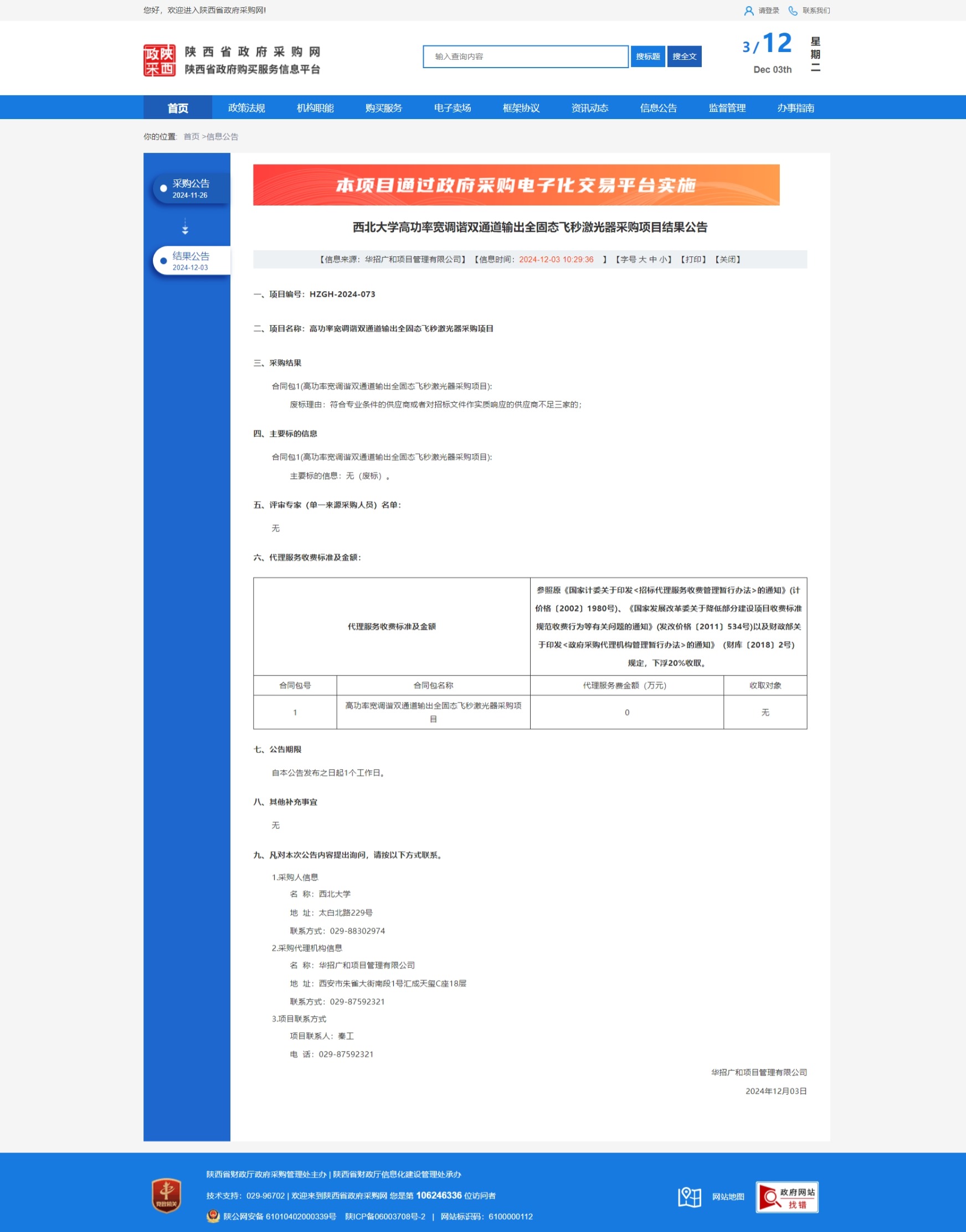 全讯600cc大白菜高功率宽调谐双通道输出全固态飞秒激光器采购项目结果公告 作者: 编辑:薛利娟 时间:2024-12-03 原公告链接:https://www.ccgp-shaanxi.gov.cn/freecms/site/shaanxi/ggxx/info/2024/8a69c44e9218572b01938a420ac318f6.html?noticeType=001006¬iceId=0b2e14ba-b120-11ef-8063-08c0eb20c666