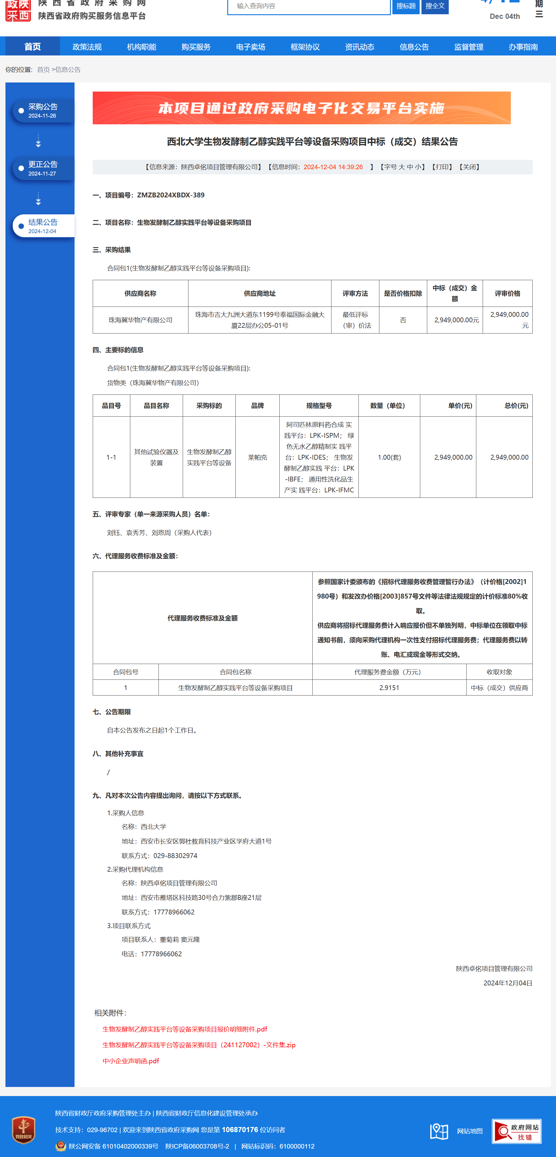 全讯600cc大白菜生物发酵制乙醇实践平台等设备采购项目中标(成交)结果公告 作者:采购与招标办公室 编辑: 时间:2024-12-04 原公告链接:https://www.ccgp-shaanxi.gov.cn/freecms/site/shaanxi/ggxx/info/2024/8a69c5a59218576d0193905cb113521a.html?noticeType=001023¬iceId=1cad3dce-b20c-11ef-8063-08c0eb20c666