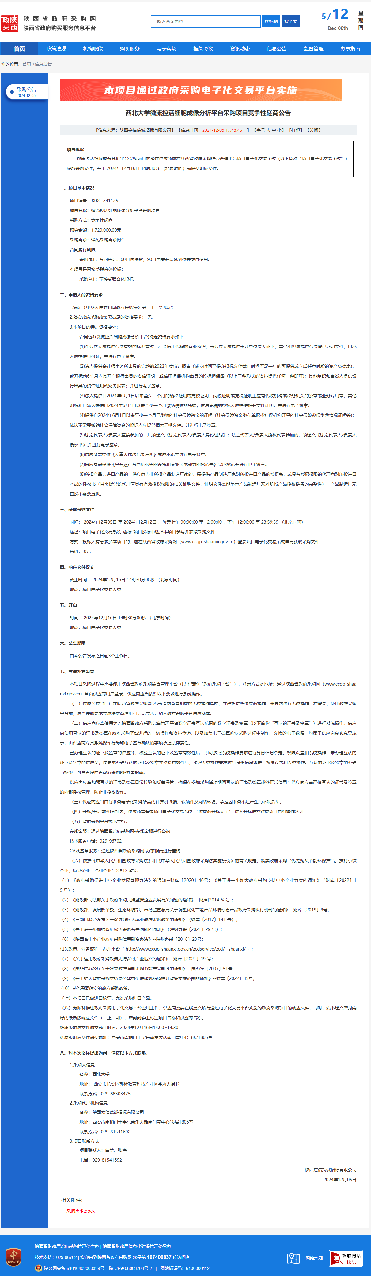 全讯600cc大白菜微流控活细胞成像分析平台采购项目竞争性磋商公告 作者:采购与招标办公室 编辑: 时间:2024-12-05 原公告链接:https://www.ccgp-shaanxi.gov.cn/freecms/site/shaanxi/ggxx/info/2024/8a69c5a59218576d0193962b8b5f7d27.html?noticeType=001016¬iceId=ba5283be-b2ef-11ef-8063-08c0eb20c666