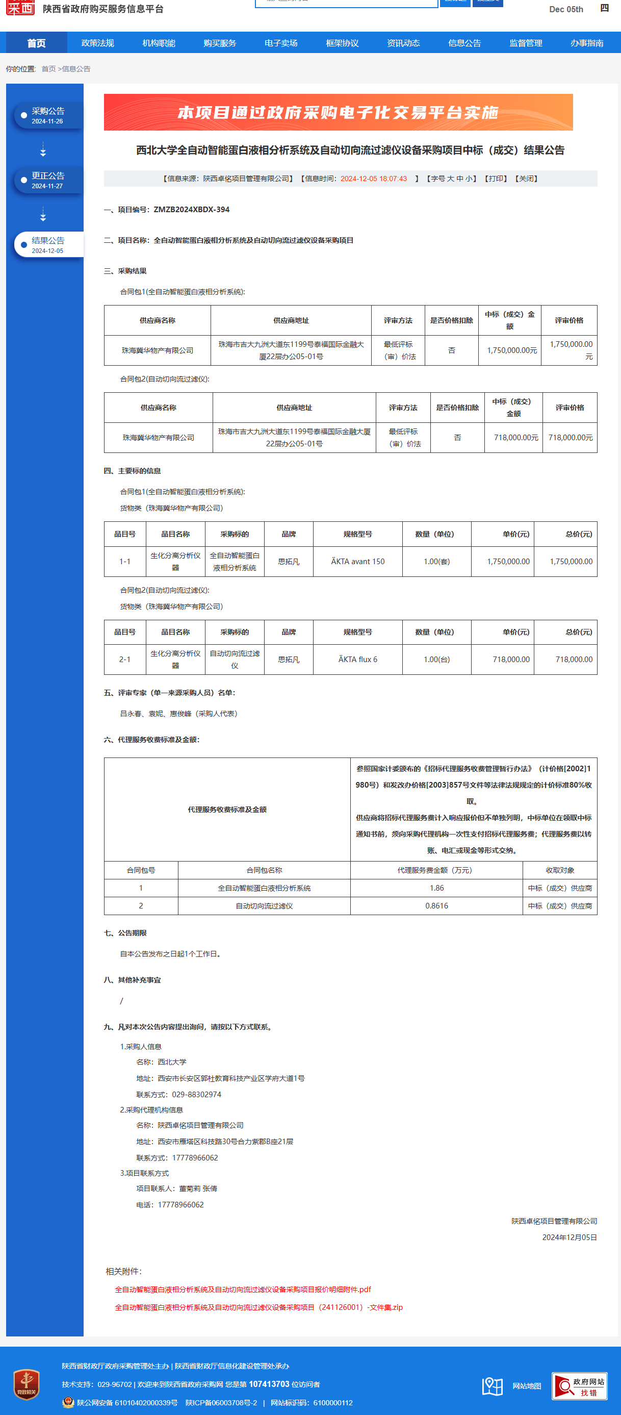全讯600cc大白菜全自动智能蛋白液相分析系统及自动切向流过滤仪设备采购项目中标(成交)结果公告 作者:采购与招标办公室 编辑: 时间:2024-12-05 原公告链接:https://www.ccgp-shaanxi.gov.cn/freecms/site/shaanxi/ggxx/info/2024/8a69c44e9218572b01939643fffe267c.html?noticeType=001023¬iceId=5fe3fe15-b2f2-11ef-8063-08c0eb20c666
