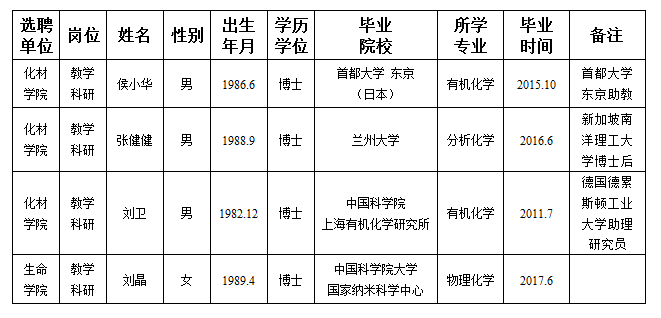 经用人单位推荐,人事处审查,学校教学督导及院系相关专家考核,白菜官网拟确定下列人员来校工作。本着公平、公正、公开的原则,为保证白菜官网选聘人员的质量,现将本次拟选聘人员基本情况公示如下: