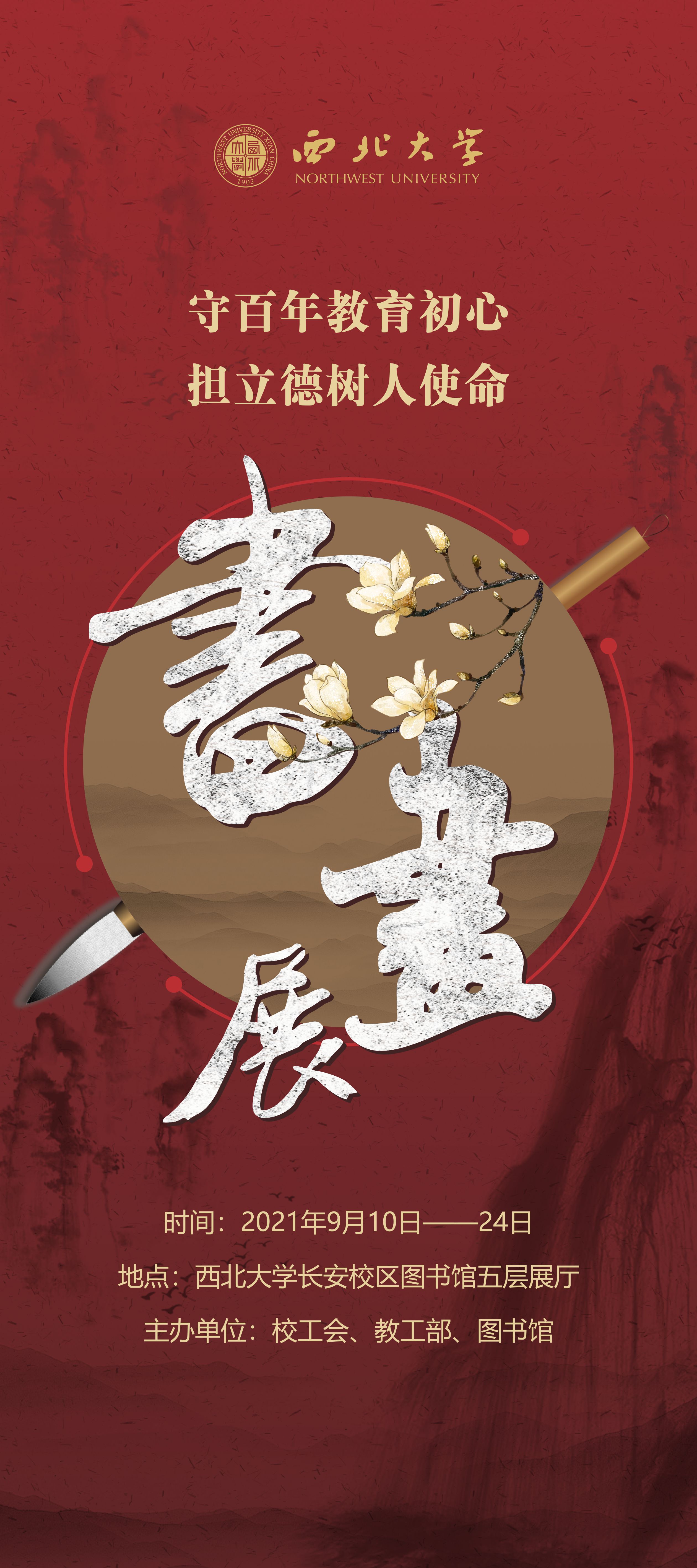 关于组织观看“守百年教育初心,担立德树人使命”主题书画展的通知 作者: 编辑: 时间:2021-09-09 各基层分会: 为庆祝我国第37个教师节,充分展示白菜官网教职工昂扬向上的精神风貌,增强广大教师立德树人的使命感和责任感,营造浓厚的校园文化氛围,学校将在9月10日至26日在长安校区图书馆五层展厅举办“守百年教育初心,担立德树人使命”主题书画展。请各分会组织本单位教职工前往观摩。 请大家遵守学校疫情防控要求,佩戴口罩,有序进入。 联系人:田霖 联系电话:88308769 校工会 教工部 图书馆 2021年9月9日