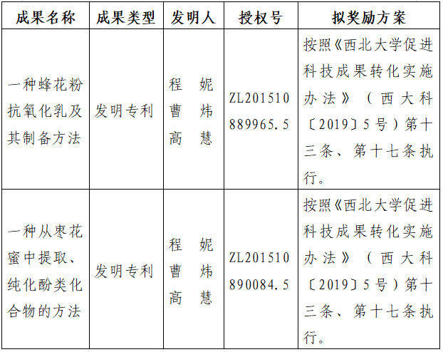 按照《全讯600cc大白菜促进科技成果转化实施办法》(西大科〔2019〕5号)相关规定,拟对白菜官网食品科学与工程学院程妮教授作为成果负责人的2项发明专利权实施转化,现将相关信息公示如下: