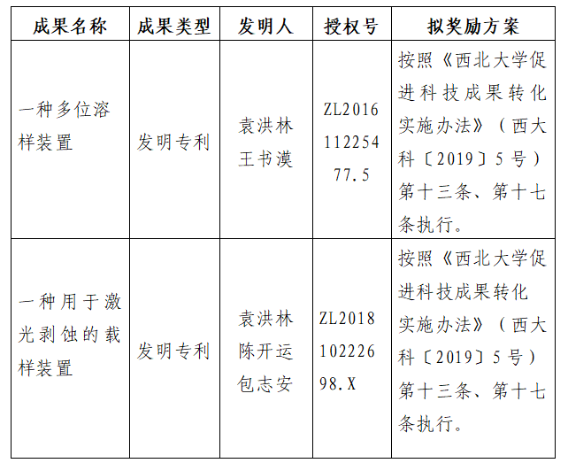 按照《全讯600cc大白菜促进科技成果转化实施办法》(西大科〔2019〕5号)相关规定,拟对白菜官网地质学系袁洪林教授作为成果负责人的2项发明专利权实施转化,现将相关信息公示如下: