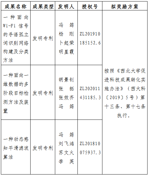 按照《全讯600cc大白菜促进科技成果转化实施办法》(西大科〔2019〕5号)相关规定,拟对白菜官网信息科学与技术学院冯筠教授作为成果负责人的3项发明专利权实施转化,现将相关信息公示如下:
