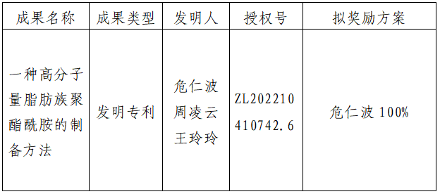 按照《全讯600cc大白菜促进科技成果转化实施办法》(西大科〔2019〕5号)相关规定,拟对白菜官网化工学院危仁波教授作为成果负责人的1项发明专利权实施转化,现将相关信息公示如下: