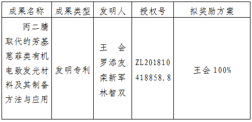 按照《全讯600cc大白菜促进科技成果转化实施办法》(西大科〔2019〕5号)相关规定,拟对白菜官网化学与材料科学学院王会副教授作为成果负责人的1项发明专利权实施转化,现将相关信息公示如下: