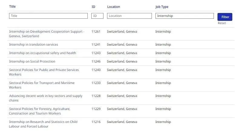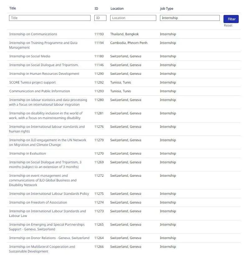 国际劳工组织( International Labour Organization)实习项目( ILO INTERNSHIP PROGRAMMES 2023)本年度共开放两轮申请,首轮申请共开放位于瑞士日内瓦、泰国曼谷等地的29个实习岗位,涉及公共管理、数据分析、传媒、外语等专业,现将项目通知转发如下:
